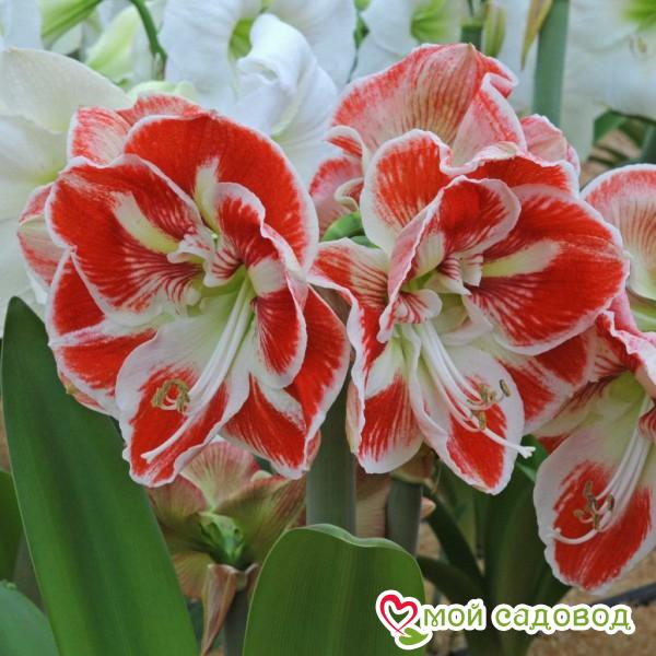 Сорт с широкими ярко-красными лепестками, отороченными бе-лой ленточкой и белыми перистыми волнами по всей поверхности. Горло зелёное. Цветет продолжительно, будет отлично смотреться в компании с другими комнатными или балконными растениями. Высота: 45-60 см. Цветение: круглый год. Высадка луковицы На дно горшка укладываем дренаж из керамзита или мелких камешков. Слой в 2 – 2,5 см. Сверху насыпаем землю, по центру ставим луковицу и засыпаем ее по бокам, оставляя верхнюю треть луковицы без земли. Поливаем отстоянной водой комнатной температуры. После посадки луковицы, примерно через месяц должно наступать цветение, которое будет продолжаться в течение 2-х или 3-х недель. Место Амариллис очень любит светлые открытые места. Идеально подойдут южные и юго-восточные окна. На лето можно высаживать в открытый грунт с южной стороны, в защищенном от ветров месте. Не любит сквозняков, особенно в зимнее время. Температура Во время бурного цветения, ему будет комфортно при температуре в +23 – 25 °C. В ночное время, допустимо снижение температуры до +18 – 20 °C. Чтобы продлить срок цветения, можно понизить температуру окружающей среды примерно до 18 °C и  убрать излишнее освещение.